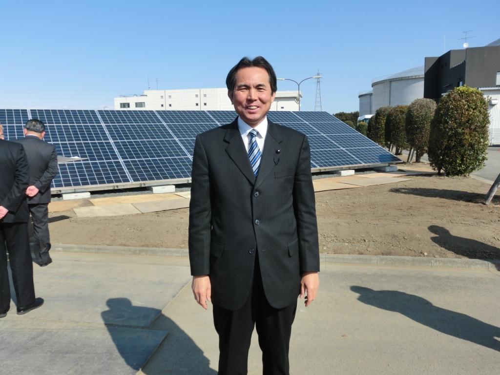 行田浄水場は、環境負荷低減の取組みで具体的には、建設中のメガソーラーの視察です。浄水場内の地下浄水地の地上部を利用して太陽光パネルを5040枚設置し、発電容量は1200kw、年間発電量は1372kwh、これによって行田浄水場の使用電力の5%を賄うとのことです。